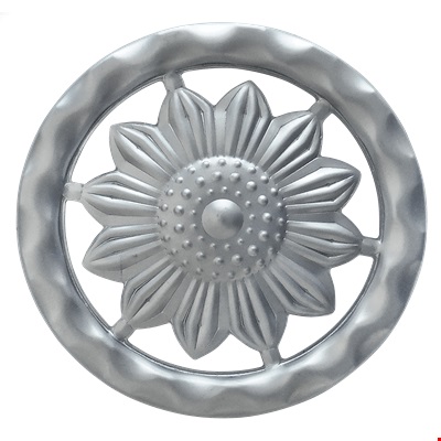 Кръгъл елемент с цвете по средата от щампована ламарина за вграждане в пана, парапети, врати, огради, декоративни елементи и други орнаменти.