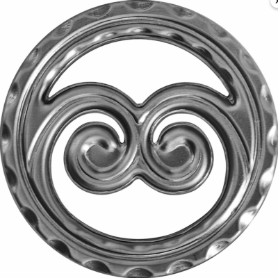Кръгъл елемент с цвете по средата от щампована ламарина за вграждане в пана, парапети, врати, огради, декоративни елементи и други орнаменти.