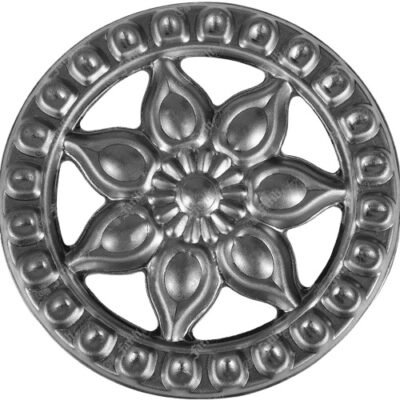 Кръгъл елемент с цвете по средата от щампована ламарина за вграждане в пана, парапети, врати, огради, декоративни елементи и други орнаменти.