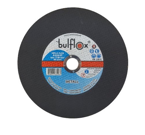 Диск за рязане на метал BULFLEX е с външен диаметър ф :300 мм, с вътрешен диаметър ф :32,2 мм, дебелина 3,5 мм. При работа носете защитни очила и ръкавици, антифони, прахова маска и устойчиви обувки. Затегнете добре диска към машината, проверете дали се върти свободно като го завъртите с ръка, след това обърнете внимание на посоката на въртене. Винаги дръжте машината така, че искрите и прахът от рязане или шлифоване да се разпръскват далеч от тялото. Преди диска да докосне работната площ, машината трябва да работи с максимални обороти.