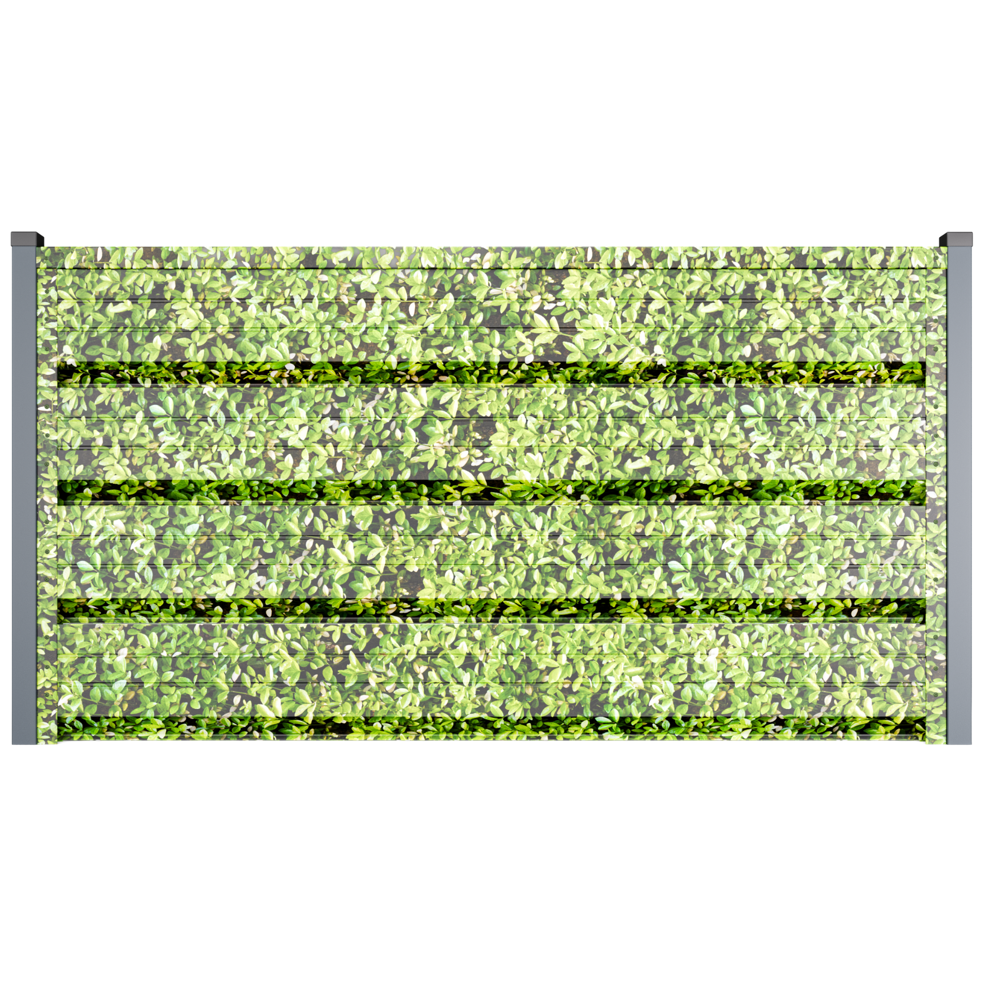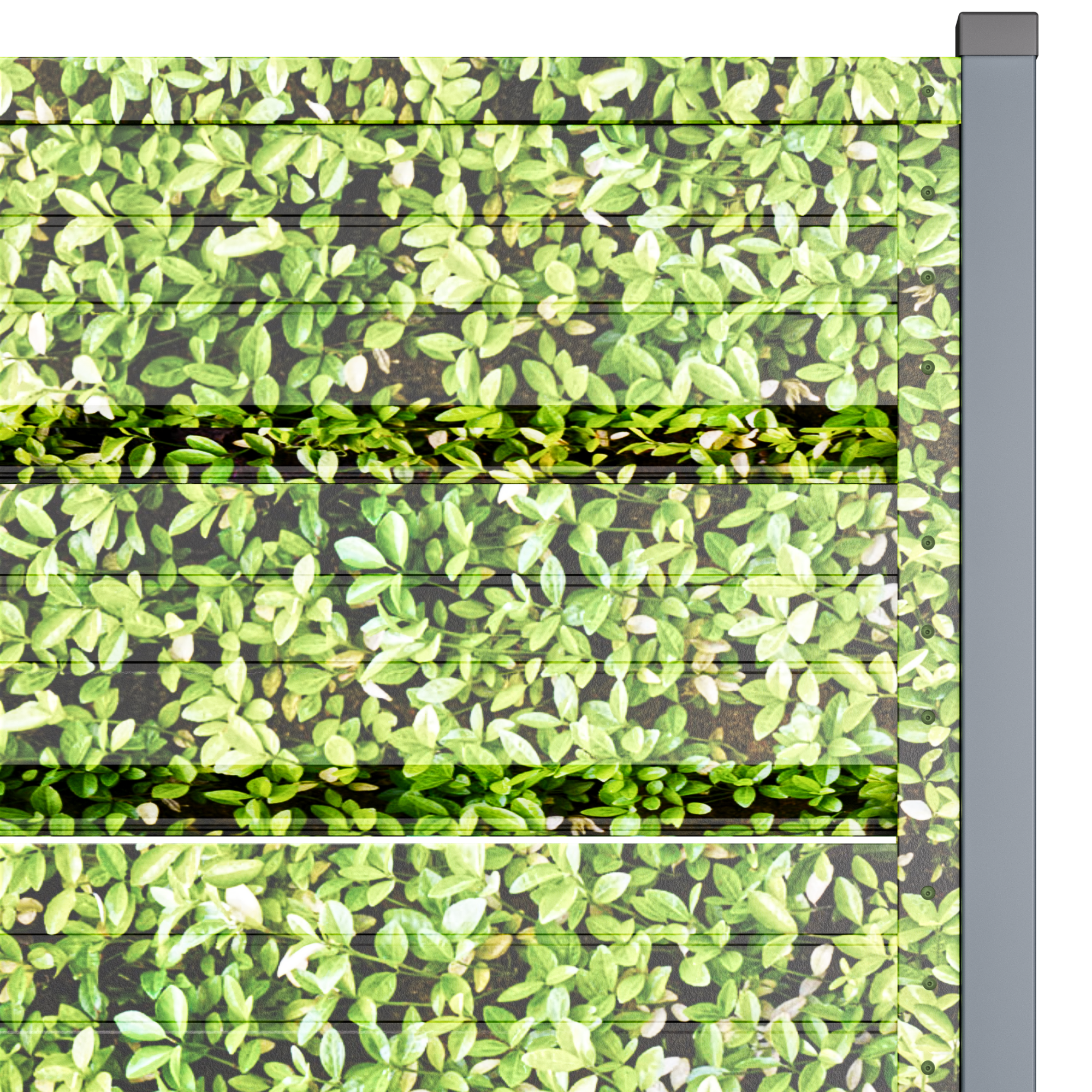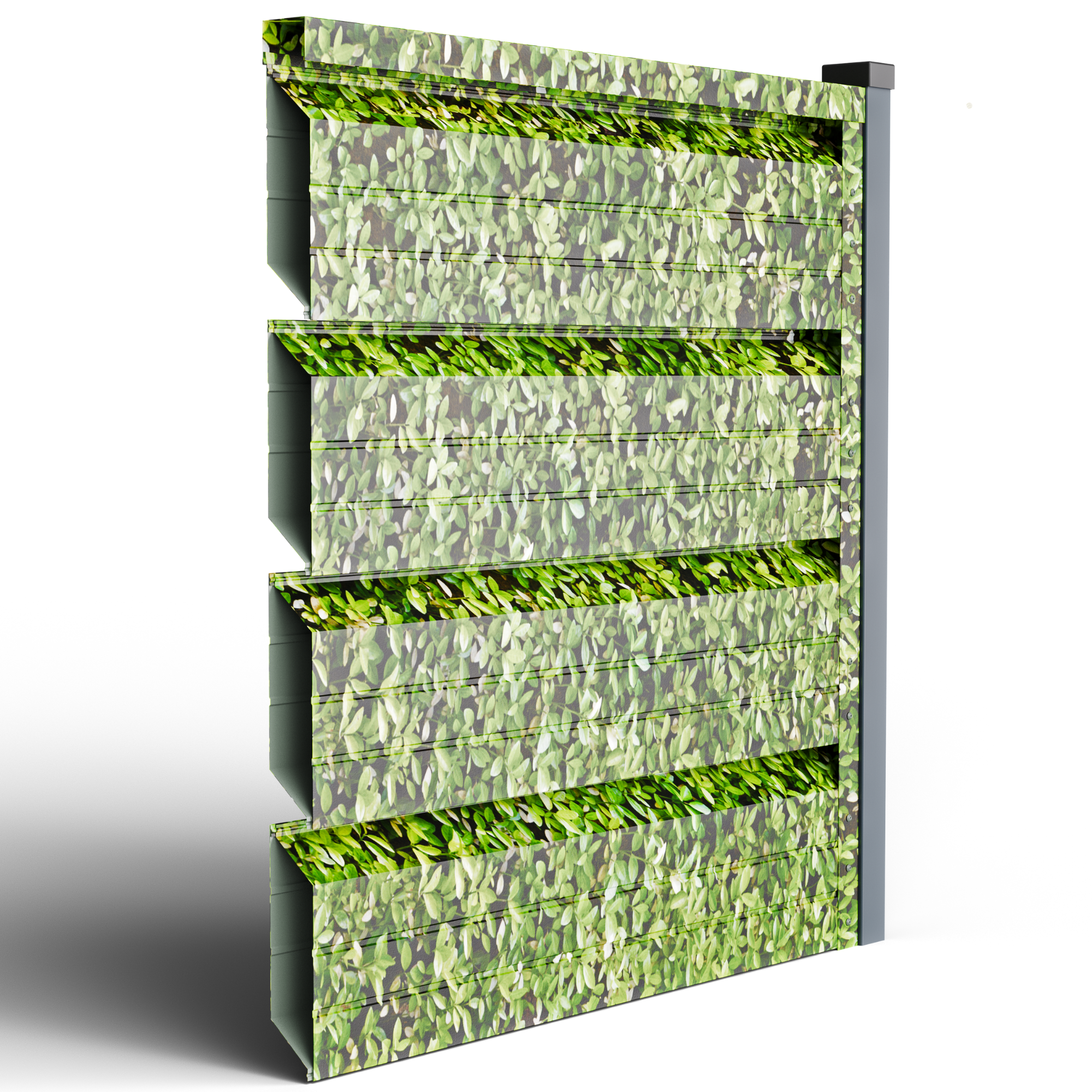 • Ефективна циркулация на въздуха и поверителност – геометрията на кутиите позволява постоянен обмен на въздух, намалявайки натрупването на топлина (без парников ефект) и поддържайки стабилен микроклимат, благоприятен за растителността; същевременно директният поглед от улицата е блокиран, запазвайки поверителността.