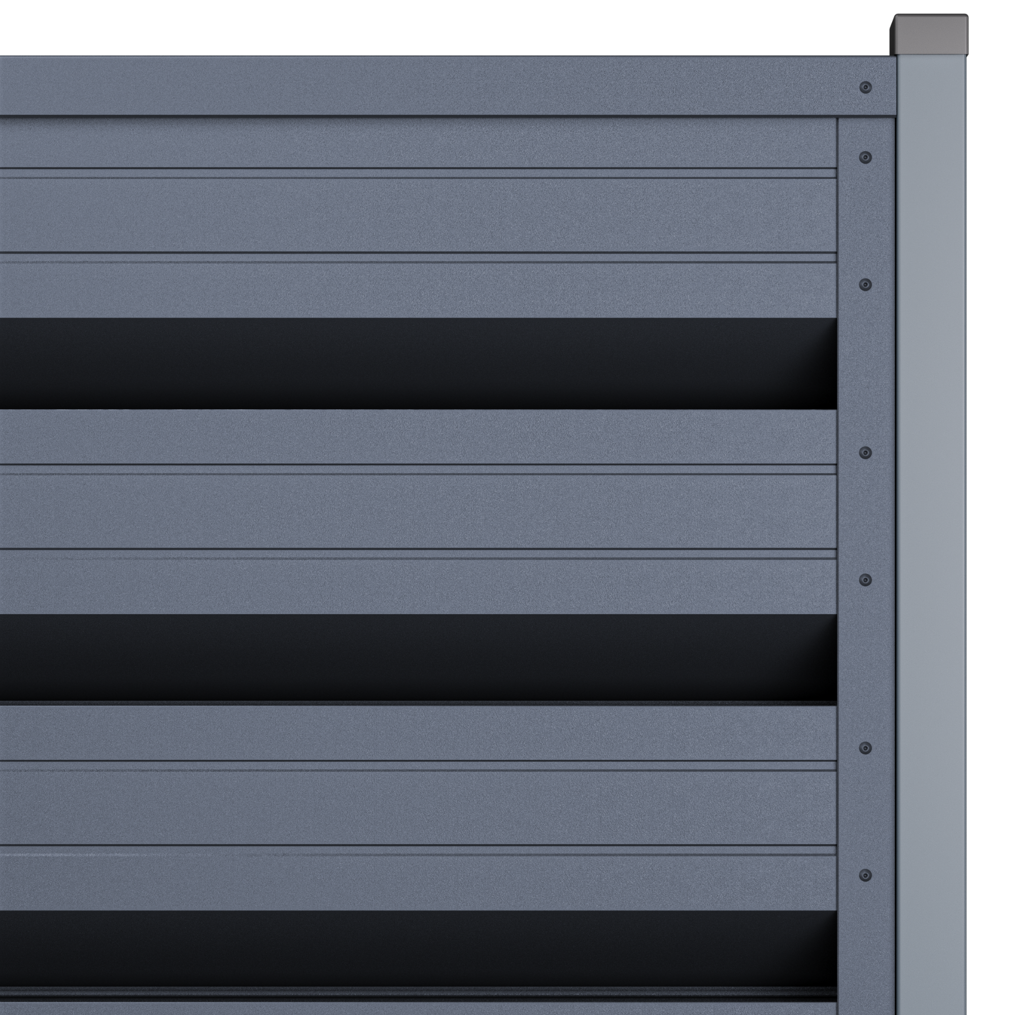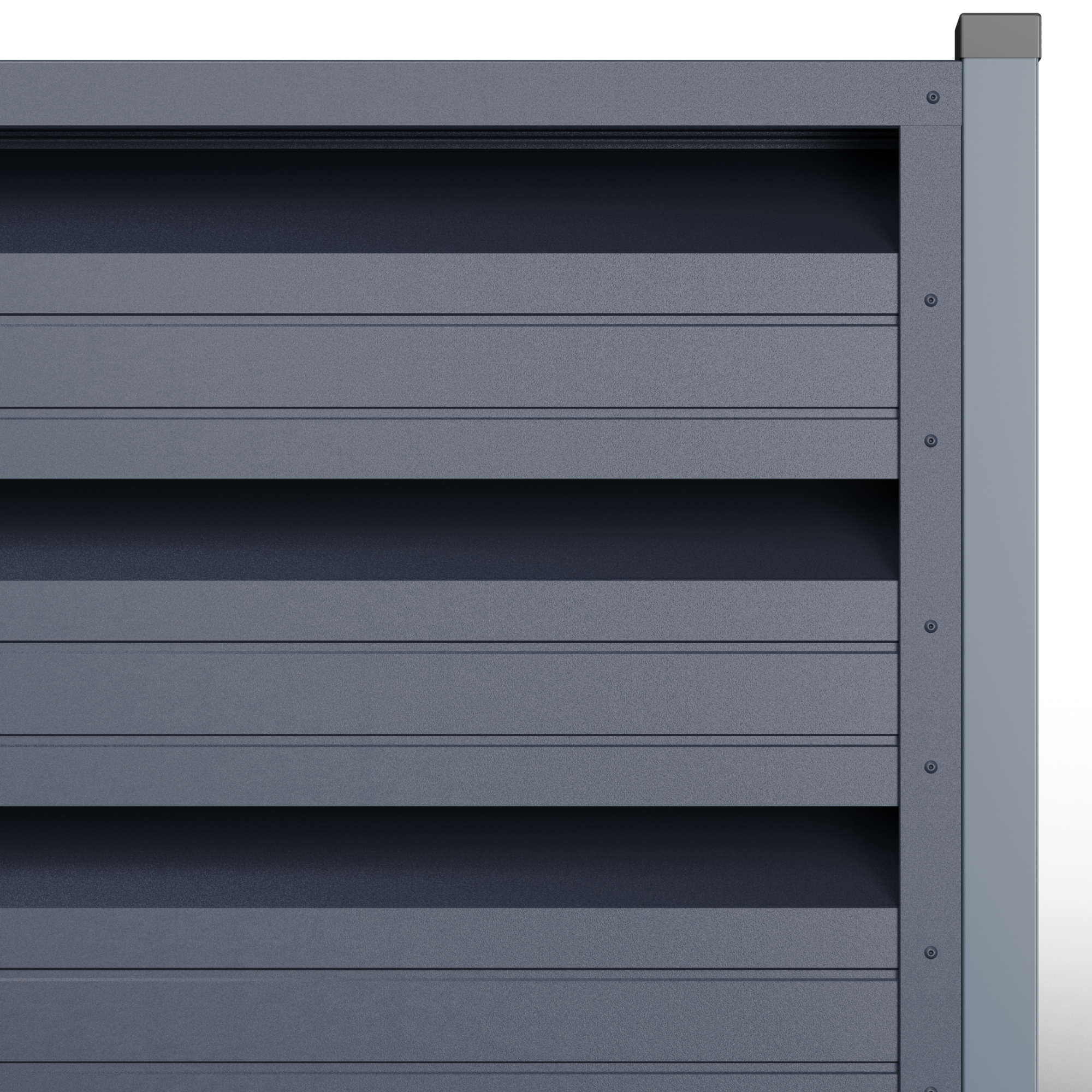 • Ефективна циркулация на въздуха и поверителност – геометрията на кутиите позволява постоянен обмен на въздух, намалявайки натрупването на топлина (без парников ефект) и поддържайки стабилен микроклимат, благоприятен за растителността; същевременно директният поглед от улицата е блокиран, запазвайки поверителността.