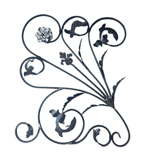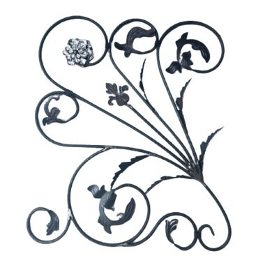 Декоративно пано от ковано желязо с листа и цветя от щампована ламарина, което може да се използва за декоративно пано за вграждане в огради, парапети, маси, столове, цветарници, люлки, беседки, решетки и други изделия от ковано желязо.