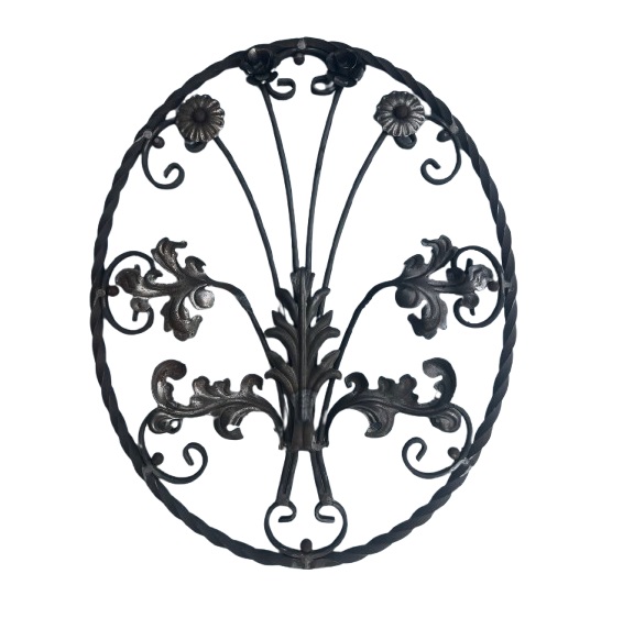Декоративно пано от усукан квадрат с листа и цветя от кована ламарина за вграждане в парапети, огради, маси, столове, цветарници, люлки, беседки, решетки и други изделия от ковано желязо.