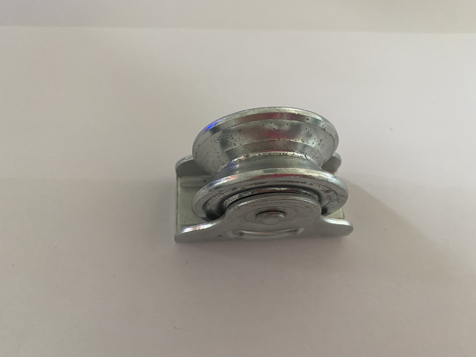 Външно V+ U-образно колело за врата, изработено от стомана с кутия. Предлага се в различни размери. V-U образното колело с канали е с кутия за завинтване или заваряване на долния профил на вратата, за да стои по-високо над релсите. Може да издържи до 100 кг.